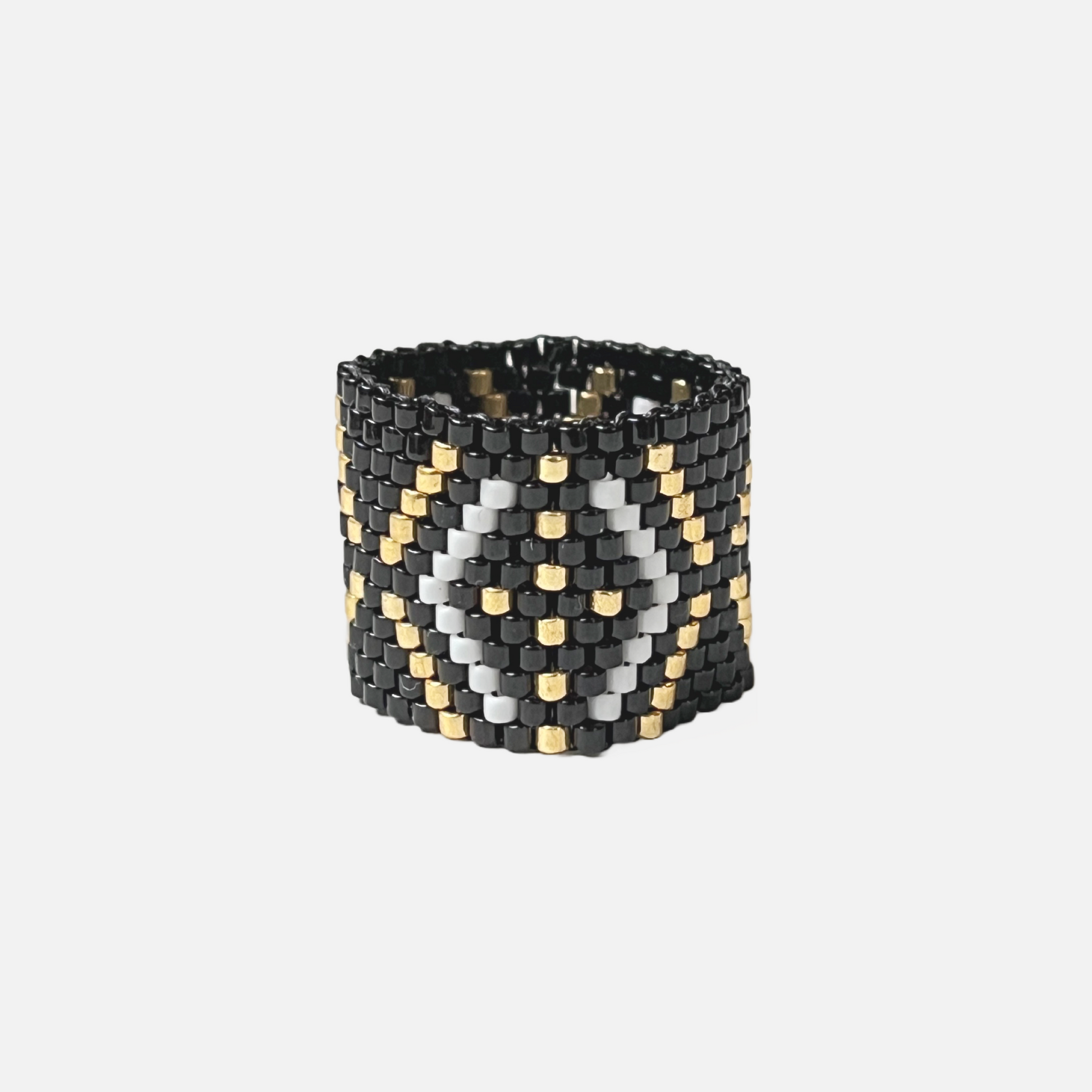 Contemporary jewelry crafted by hand. These woven ring feature delicate glass beadwork.